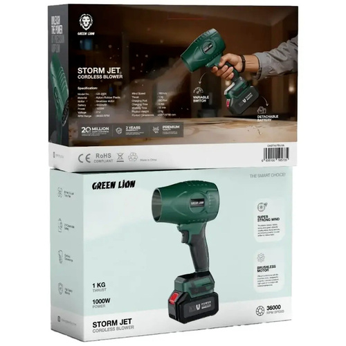 جت فن 1000 واتی گرین لاین مدل SJ36000 یک ابزار قدرتمند و پرکاربرد با امکان استفاده بسیار راحت و سریع برای تمیزکاری فضا های باز ، خشک کردن خودروها ، پاک کردن برف … و موارد گوناگون که به یک فن فوق قوی نیاز است میباشد..این دستگاه دارای موتور براشلس مورد استفاده در درونهای بزرگ میباشد که با قدرت 1000 واتیش سرعت باد شگفت انگیزی معادل 100 متر بر ثانیه را تولید میکند و به راحتی قادر به جابجایی زبالهها، برگها و گرد و غبار در فضا های مختلف مانند حیاط، پارکینگ یا تراس ونیز پخش کردن و خشک کردن خودرو بعد از شستشو میباشد. سرعت بالای چرخش فن تا 36000 دور در دقیقه، کارایی آن را به حداکثر میرساند و به شما این امکان را میدهد که بهسرعت محیط را تمیز کنید. این جت فن با باتری خشابی 21 ولتی و با ظرفیت 4000 میلیآمپر ساعت، امکان استفاده بیسیم را برای 15 دقیقه فراهم میکند. شارژ کامل دستگاه تنها 4 ساعت طول میکشد و از درگاه DC برای شارژ استفاده میشود. همچنین، با توجه به ساختار مقاوم بدنه آن از جنس PVC جت فن گرین لاین در برابر ضربه ها و شرایط سخت محیطی دوام بالایی دارد.